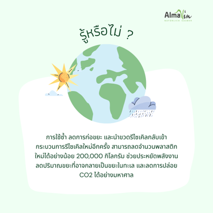 In addition, we still maintain the concept (concept) organic and vegan (Vegan), so the label on all types of Almawin bottles. Therefore, it is printed with natural, crude-free inks. and attached with plant-based vegan glue to ensure that in the future The amount of plastic waste in the world will not increase any more. That's why we use 100% recycled PE or PET plastic bottles to incentivize the recycling industry. Friendly to the browser (consumer-friendly) and is known as a protector of the environment.